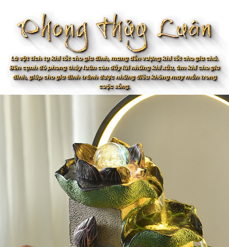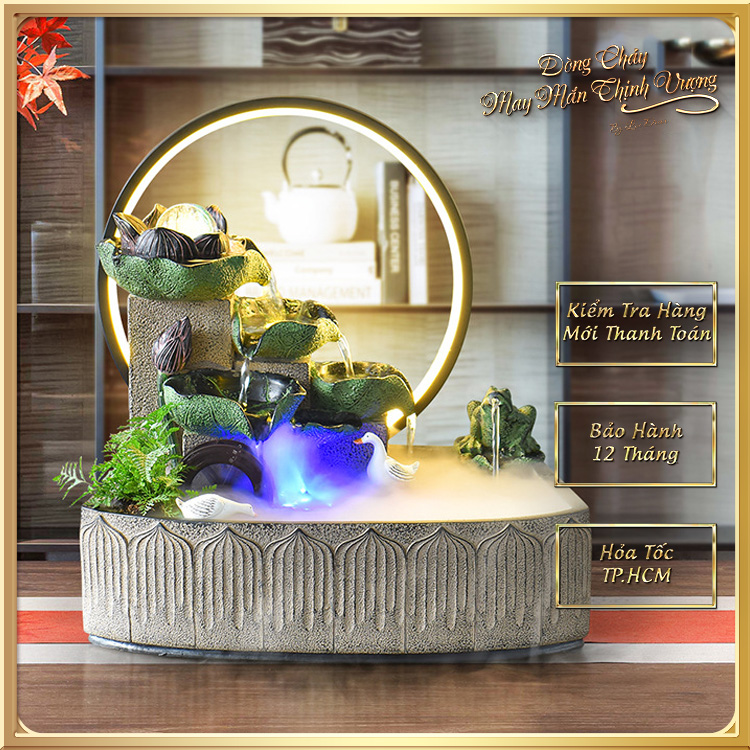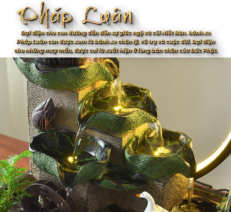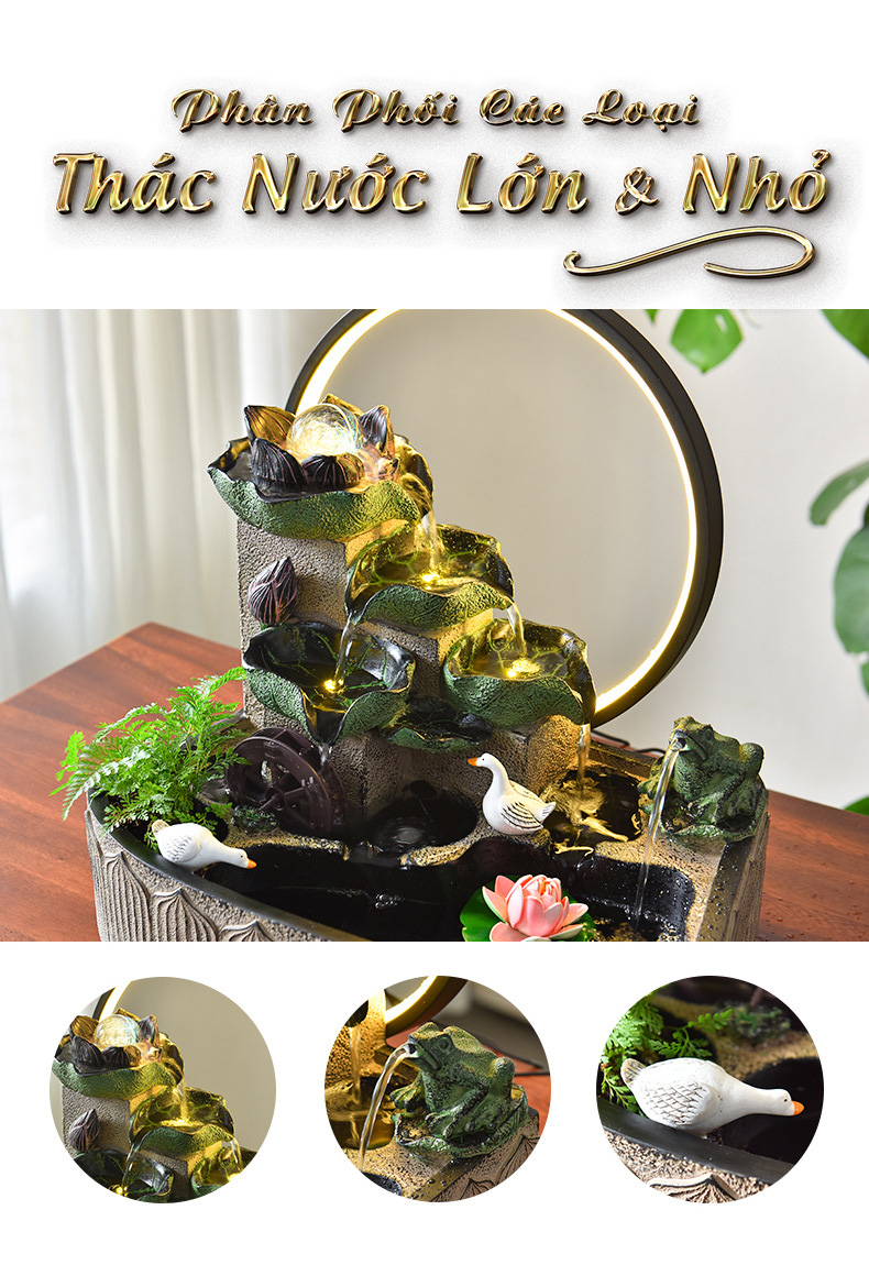 - Bộ sản phẩm bao gồm: máy bơm, thác nước tiểu cảnh, vòng đèn led, các tiểu tiết trang trí